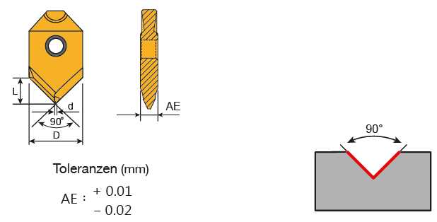 Der vielseitigste Schneideinsatz von YT. Mit seinem 90° Anschliff ist er geeignet zum Zentrieren, Anbohren, Senken, Fasen und Gravieren.